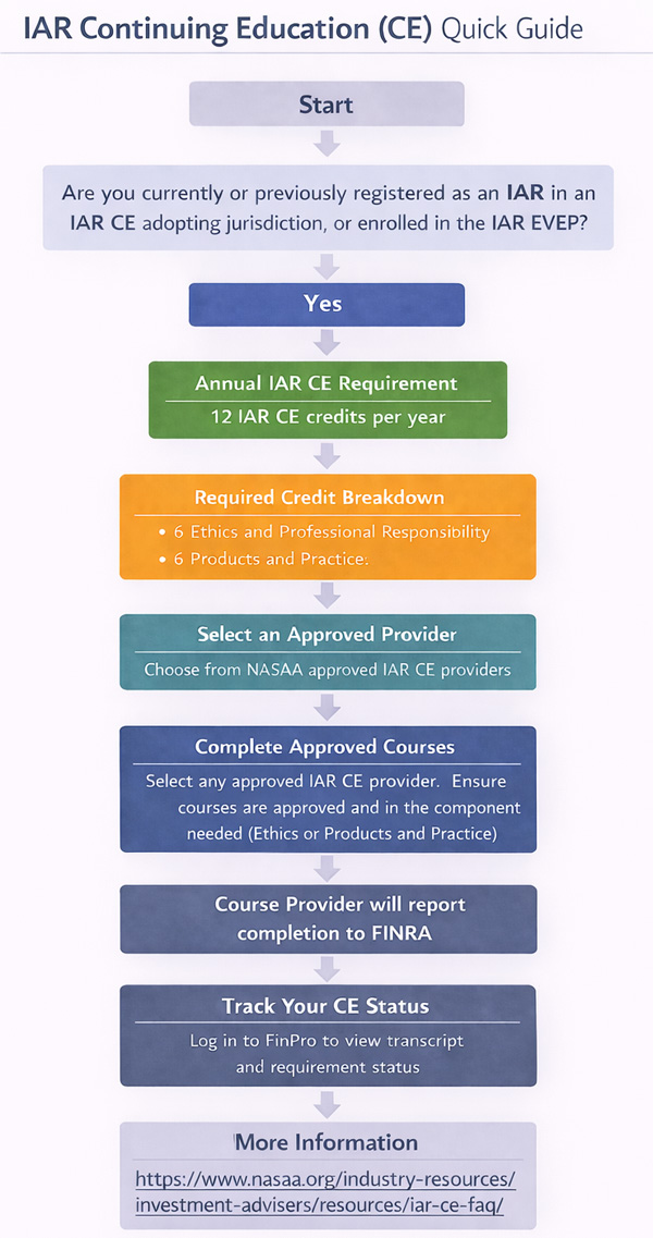 Welcome to the resource page for NASAA’s Investment Adviser Representative Continuing Education (IAR CE) program. NASAA’s IAR CE model rule represents the culmination of years of work by state securities regulators and industry to develop a relevant and responsive continuing education program. Below you will find information on member adoption, approved IAR CE providers, informative FAQs, and more.