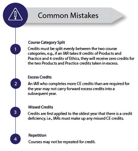 - IAR CE requirements are maintained if an IAR has been registered with a state which requires IAR CE (an in-scope state) for any part of the year. Thus, even if an IAR withdraws from an in-scope state, the requirement continues to exist and may affect future registration(s) in in-scope states. Essentially, once an IAR has the requirement, they will always have the requirement and the deficiency will continue to accumulate to a maximum of 36 credits if not maintained annually.